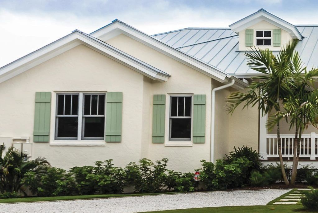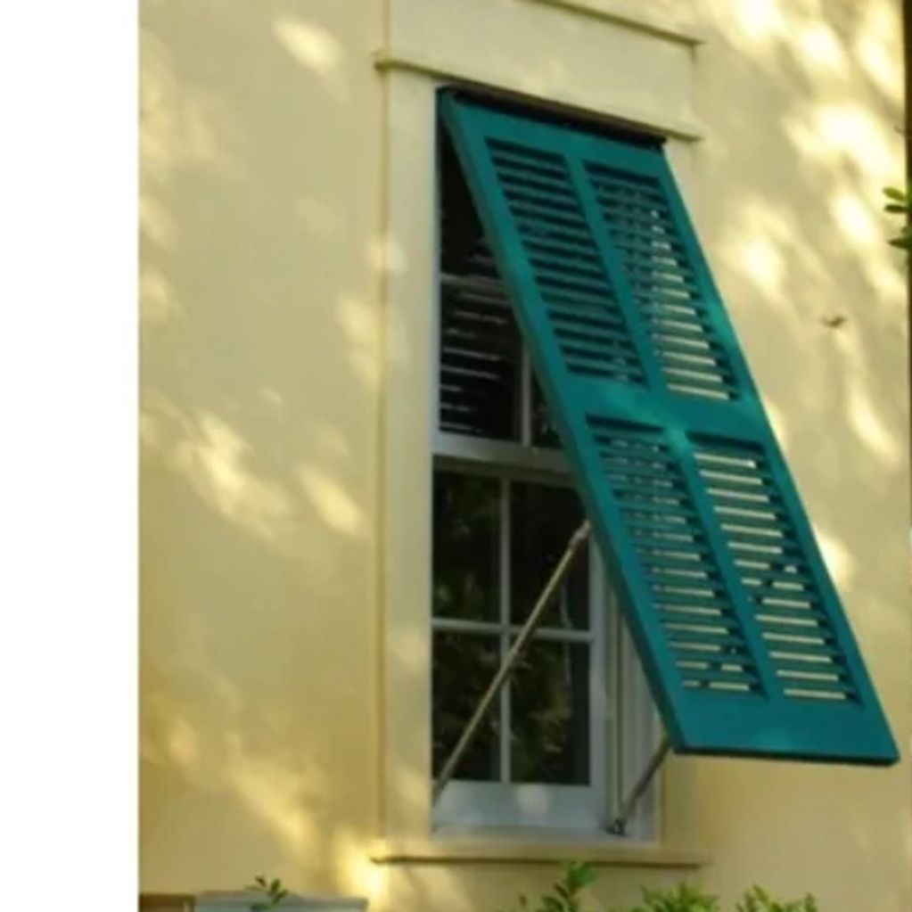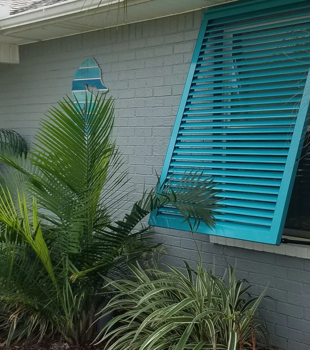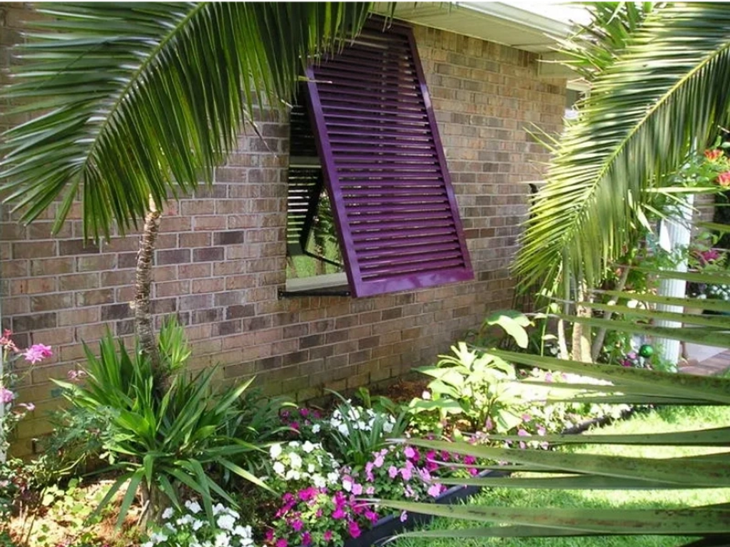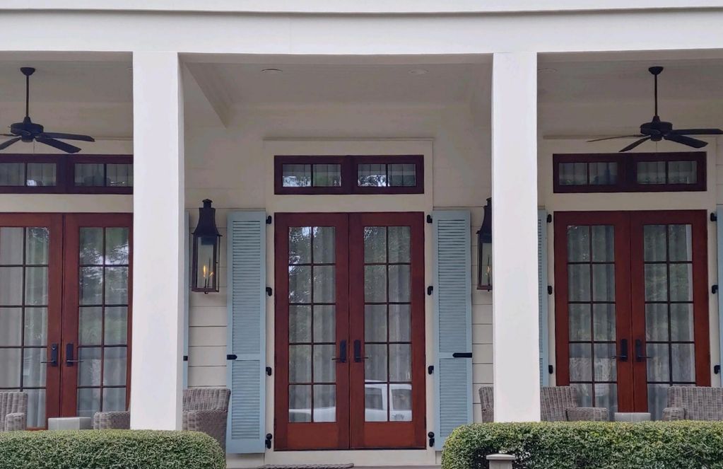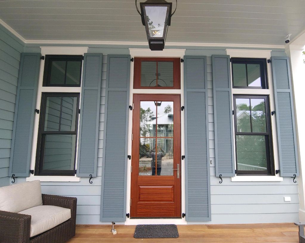 Decorative Spanish Cedar louvered shutters enclosing a porch
